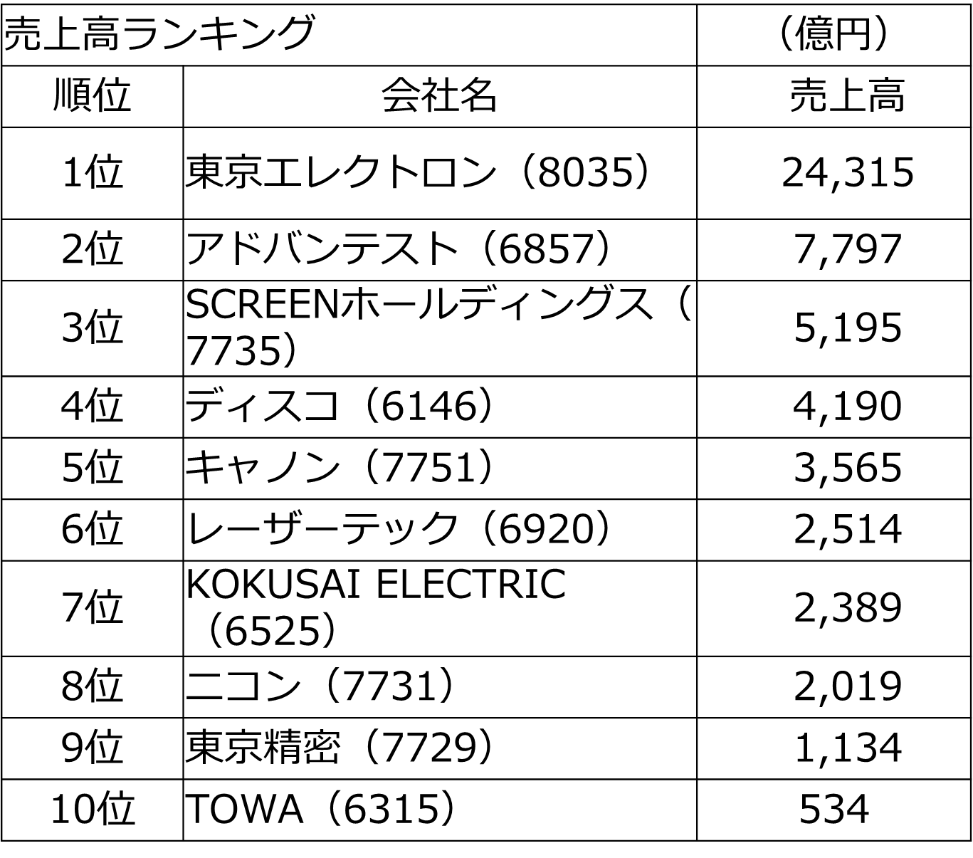 半導体製造装置業界の売上高ランキング(2024‐2025年)