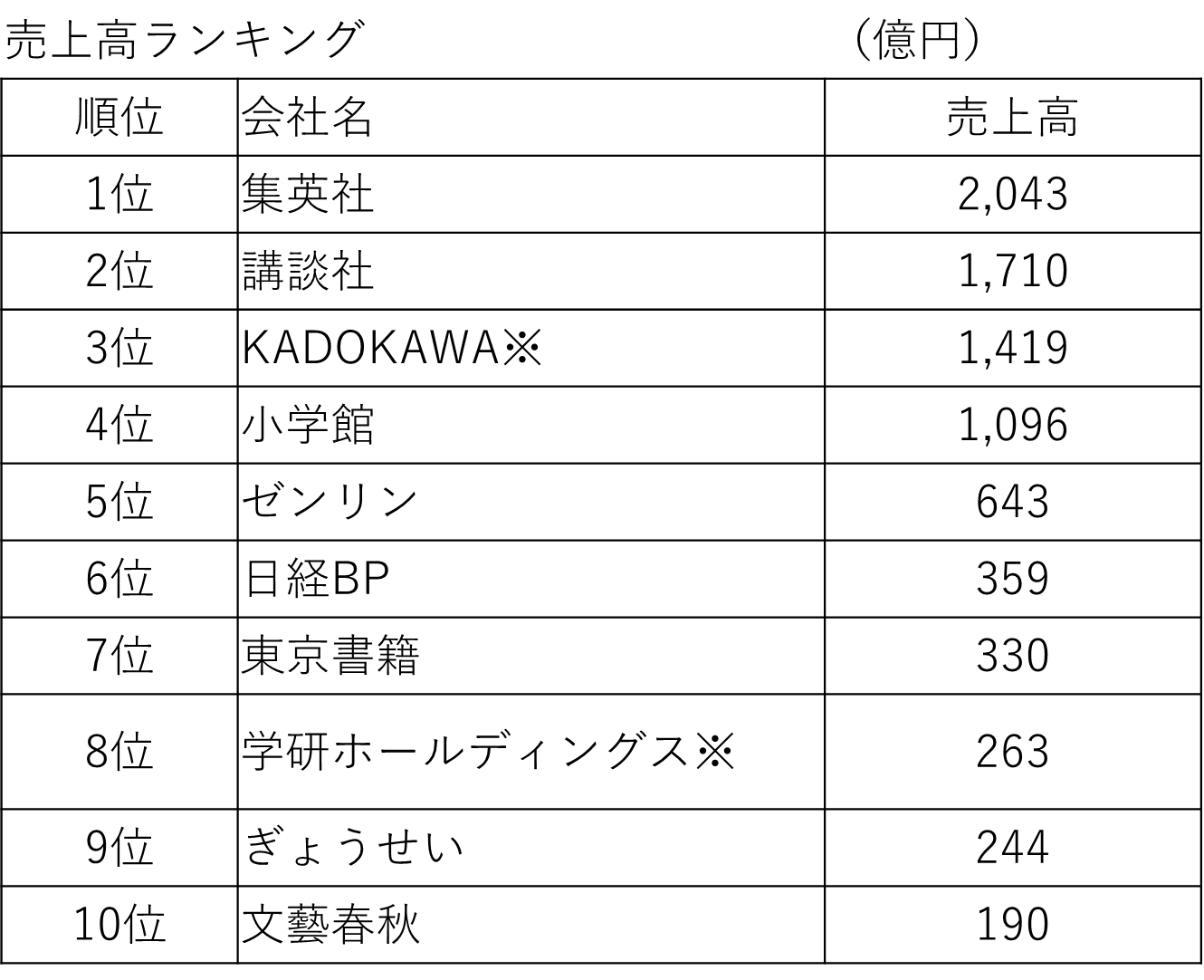 出版業の売上高ランキング(1位~10位)は、以下の通りです。