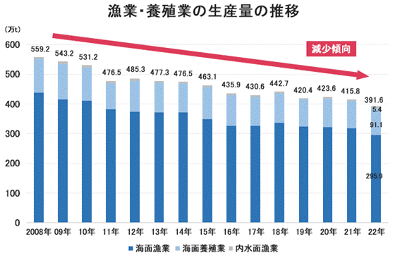 海面漁業の生産量は前年比6.9%減の295.9万t、海面養殖業は同1.7%減の91.1万t、内水面漁業は3.8%増の5.4万tでした。2022年は海面漁業、海面養殖業がともに減少しましたが、内水面漁業は増加しました。長期的に見ると海面・内水面漁ともに減少傾向です。