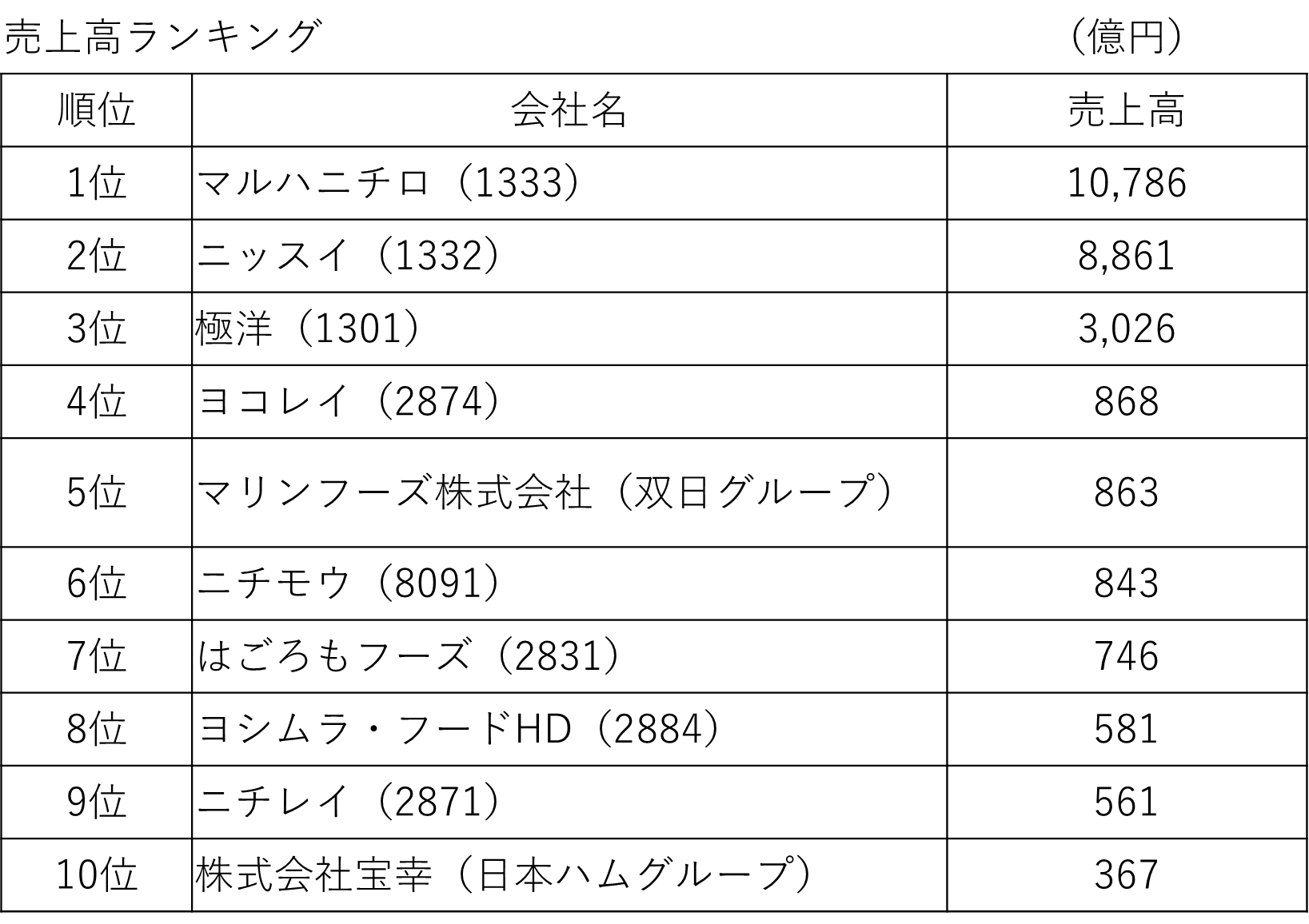 水産業の売上高ランキング(1位~10位)は、以下の通りです。