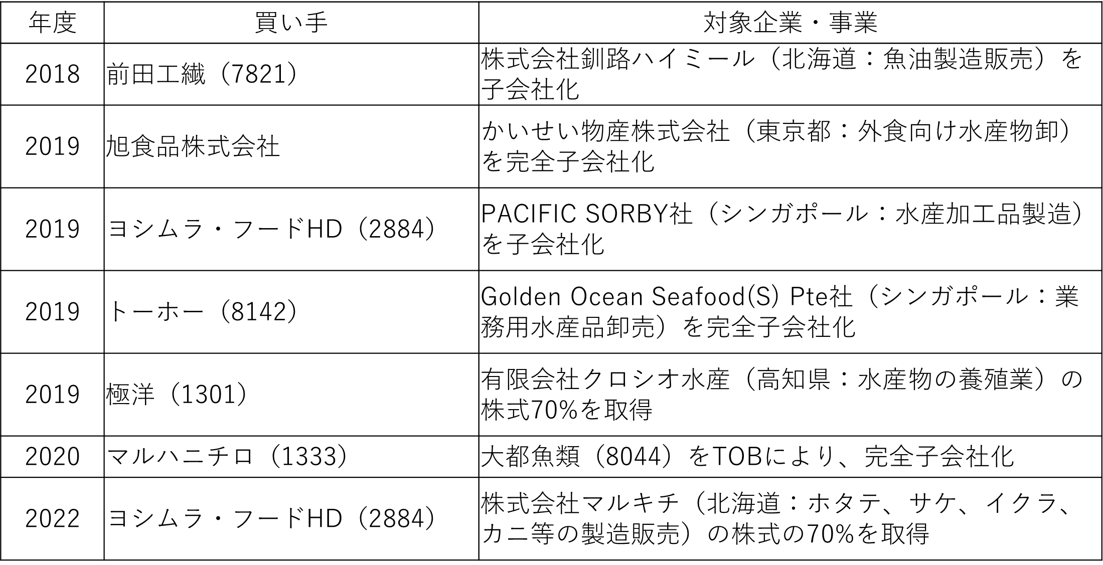 過去の水産業界のM&A(一部)