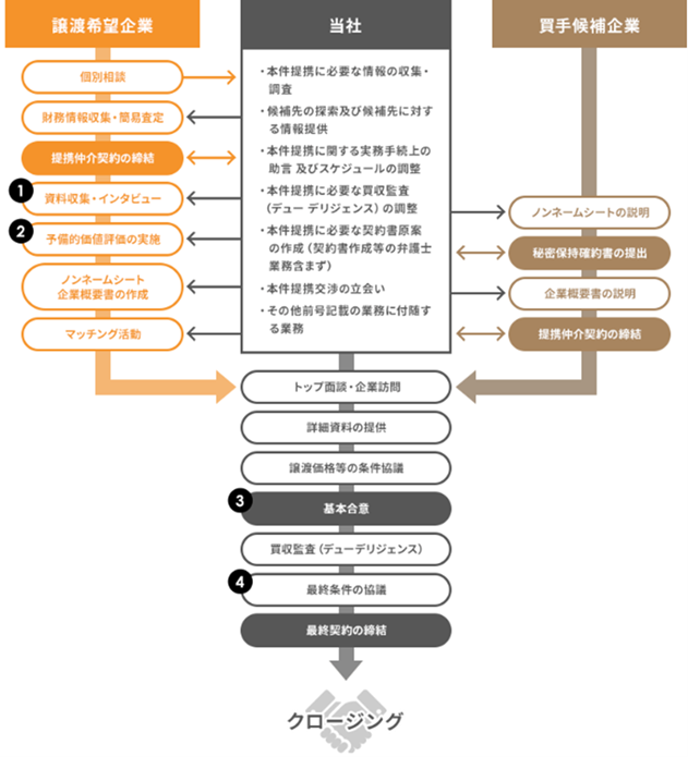 ③買手候補企業との間で大枠の条件が固まったら基本合意書(法的拘束力無し)を締結します。この段階より1対1の交渉(独占交渉)が始まります。