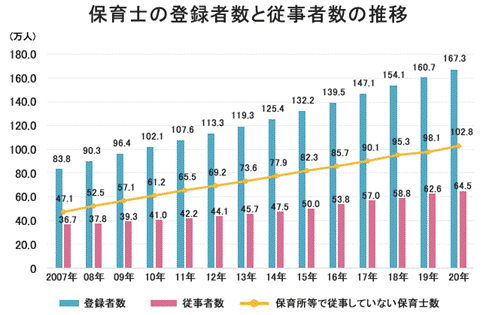 保育士の登録者数は増加していますが、保育所等で従事していない保育士数も増加傾向にあります。保育士が定着しない要因としては、長時間労働や低賃金などが挙げられます。