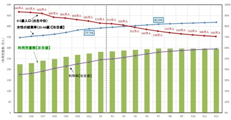 保育園の利用対象となる0~5歳人口は減少が続きますが、女性の就業率は今後も上昇