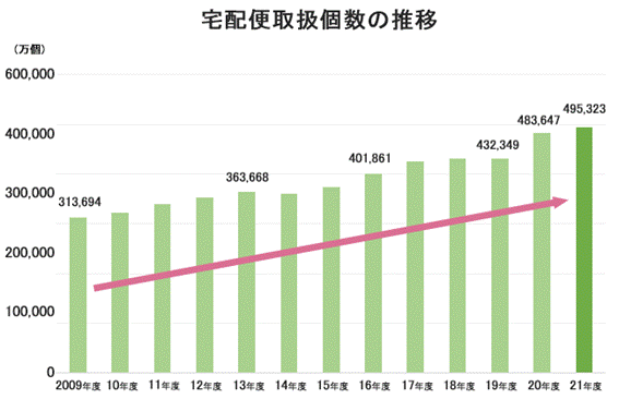 宅配便取扱個数の推移を見ると、2021年度にかけて増加傾向にあることが分かります。特に、2020年と2021年の成長が著しく、直近の2年で大幅に増加しました。