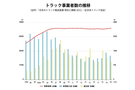 具体的には、トラック事業者数は、1994年の約4万5,000社から2007年には6万3,000社超へ増加しました。その結果、事業者間の競争が激化し、その後、事業者数は横ばいで推移しています(グラフ「トラック事業者数の推移」)。